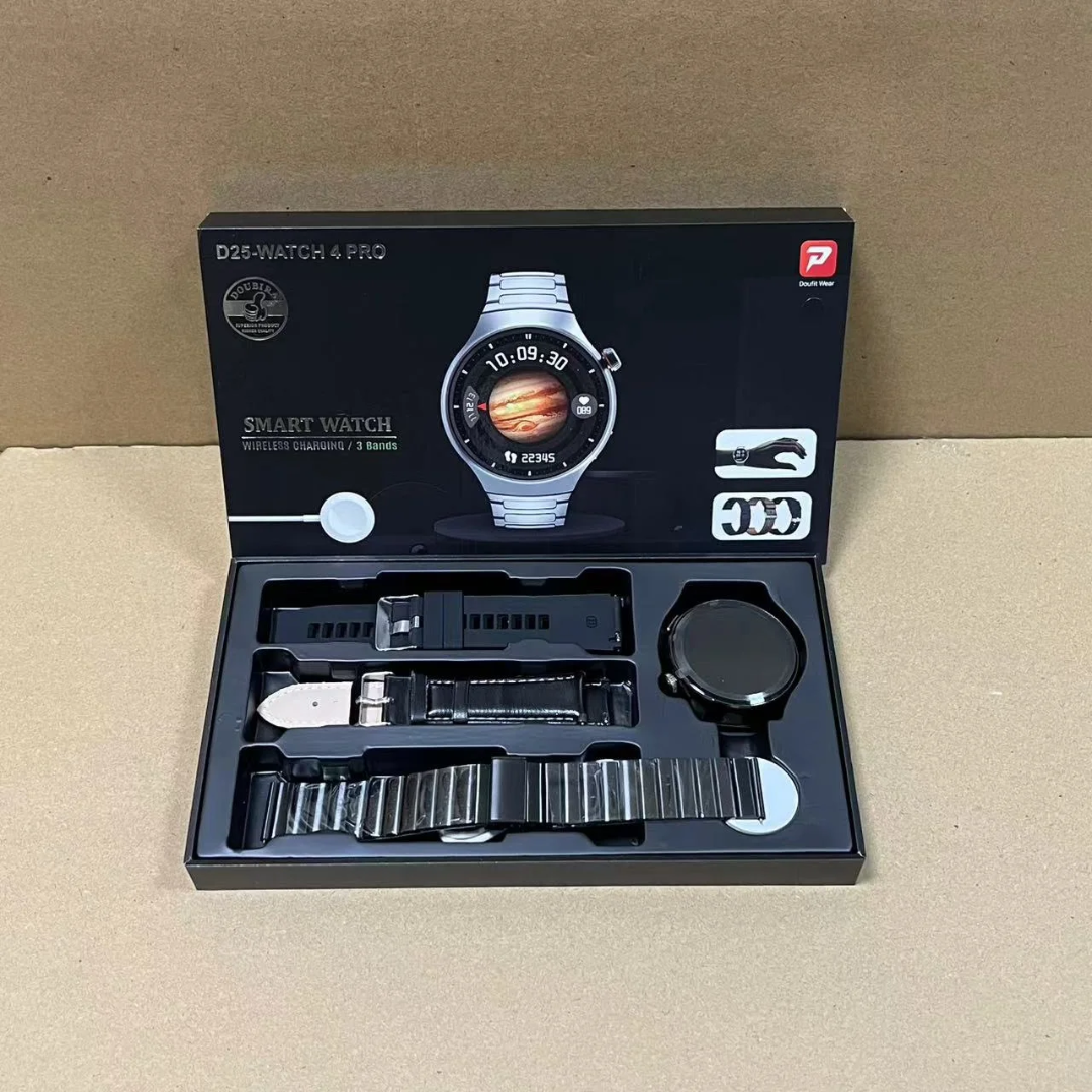 Montre D25 Watch 4 Pro, 3 bracelets (cuir, silicone, acier inoxydable), chargeur magnétique sans fil et manuel d'utilisation.